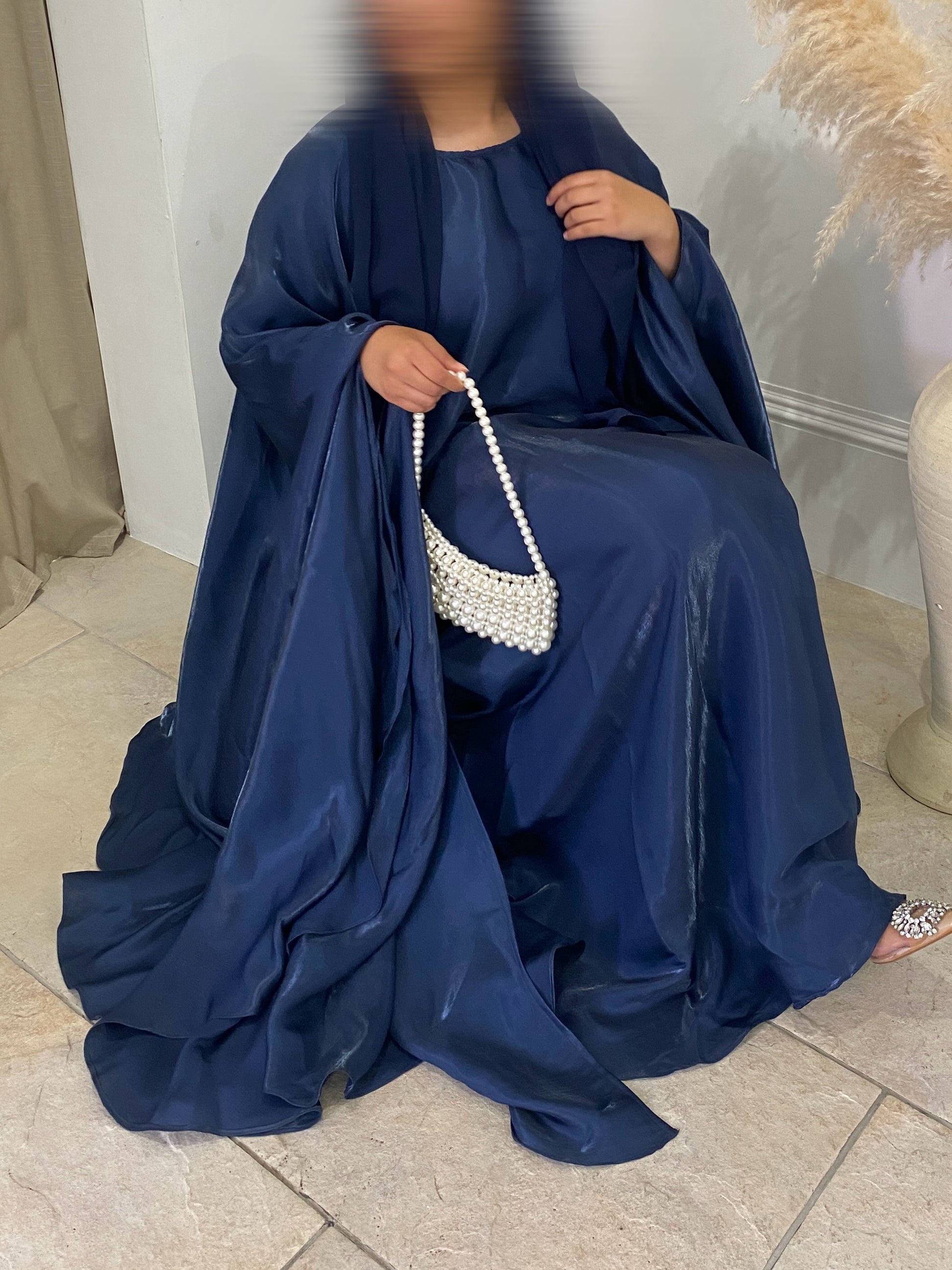 In its rich midnight hue, this abaya captures the essence of refined luxury - serene, graceful, and endlessly versatile. Every movement reveals a subtle shimmer, a bloom of elegance that lingers long after you’ve passed.